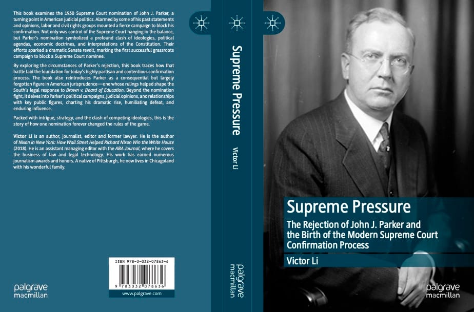 I’ve very happy to announce that my second book, Supreme Pressure: The Rejection of John J. Parker and Birth of the Modern Supreme Court Confirmation Process, will be released January 8, 2026 by Palgrave Macmillan. What a way to ring in the New Year!